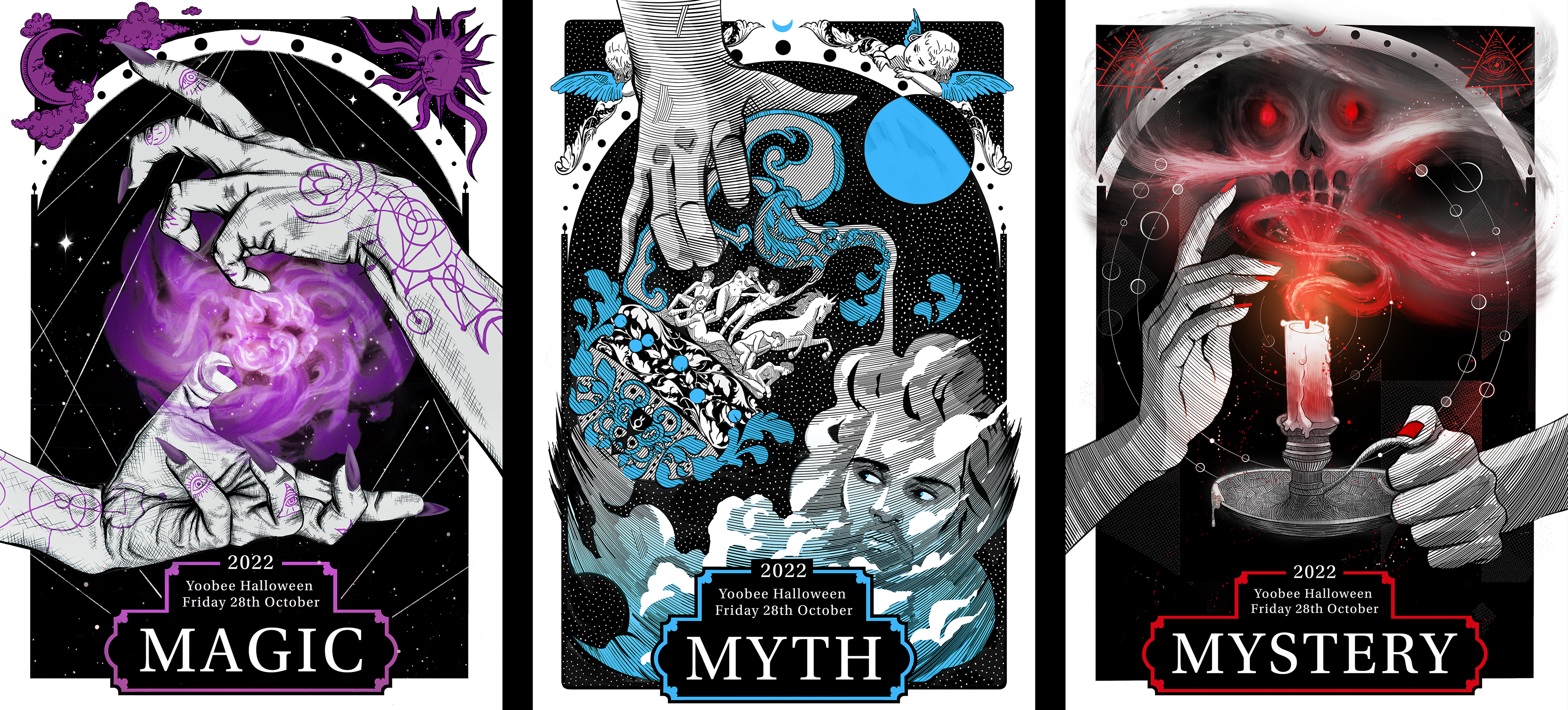 Promotional Halloween posters created for Yoobee College of Creative Innovation. The aim was to create excitement for the students, and build a sense of intrigue for this campus wide event!